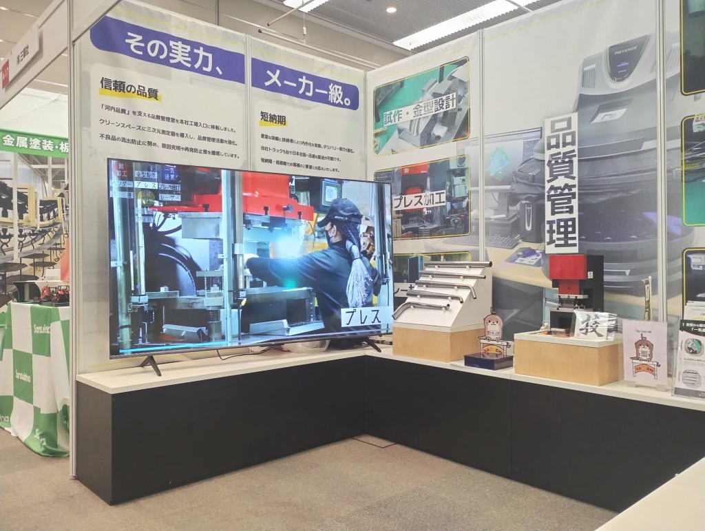 さらに、壁面の展示パネルを通じて、金型製作から製造・梱包・物流までを自社で担う「一気通貫」の体制や、「品質管理」「難加工」といった当社の強みについて理解を深めていただけたと実感しております。